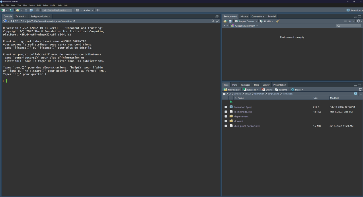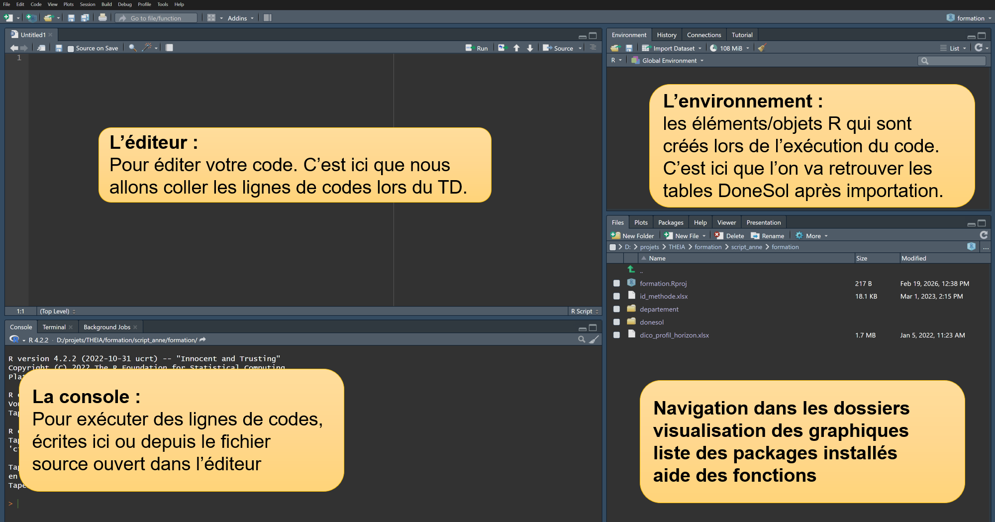 Pour le TD, nous allons utiliser RStudio. Nous allons tout mettre dans le dossier “formation” fourni.