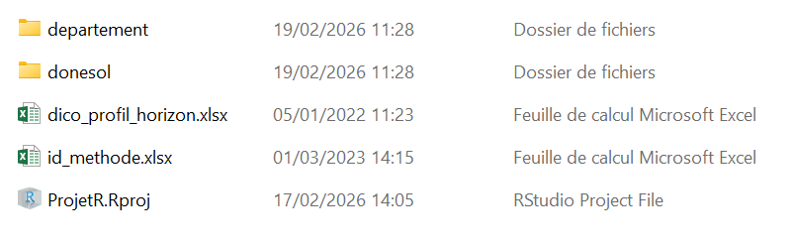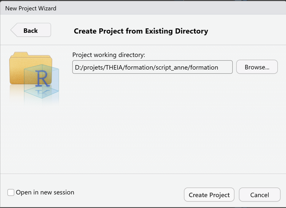 Le répertoire courant devient celui dans lequel vous avez créé le projet. Un fichier d’extention .Rproj a été créé dans ce répertoire. Il suffira d’ouvrir ce fichier à l’avenir pour ouvrir RStudio pour travailler sur ce projet.