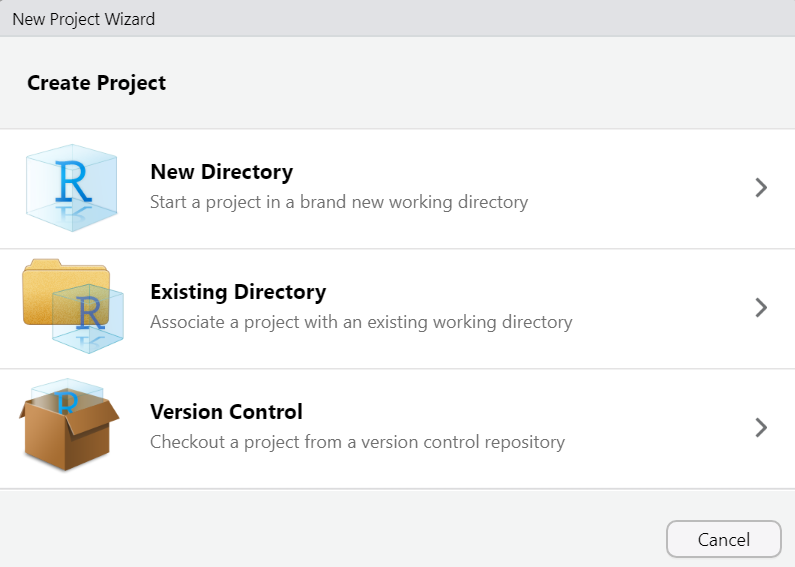 - Vous aurez ensuite à faire un choix parmi 3 options : New Directory, Existing Directory ou Version Control. Ils correspondent aux 3 manières de créer un projet :