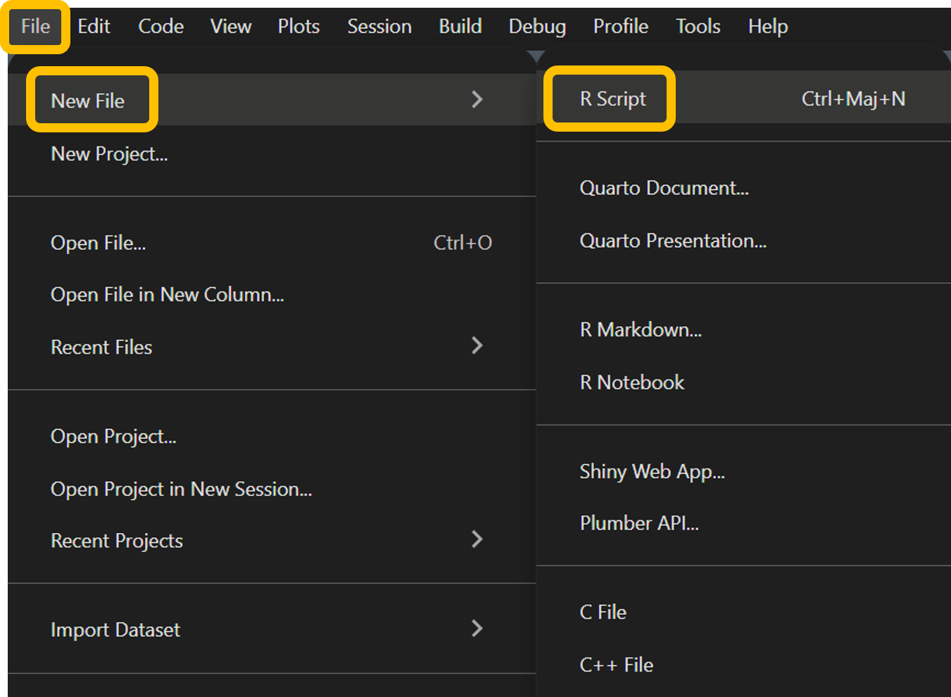 À présent que le projet est créé, il est temps de créer un fichier de script : dans RStudio, cliquez sur le menu “File”, puis sur “New File” et enfin sur “R Script”.