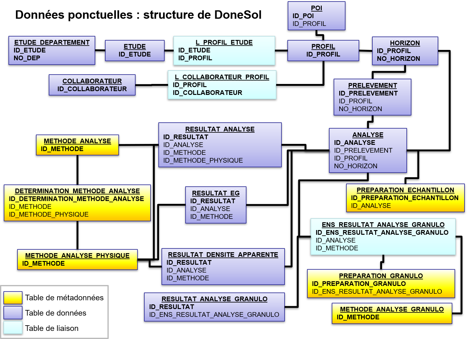 Les données sont donc en format DoneSol et sont réparties dans différentes tables reliées entre elles. Les données utilisées sont des données ponctuelles issues de la description de profils et de sondages sur le terrain. Le schéma suivant présente la structure DoneSol pour les données ponctuelles :